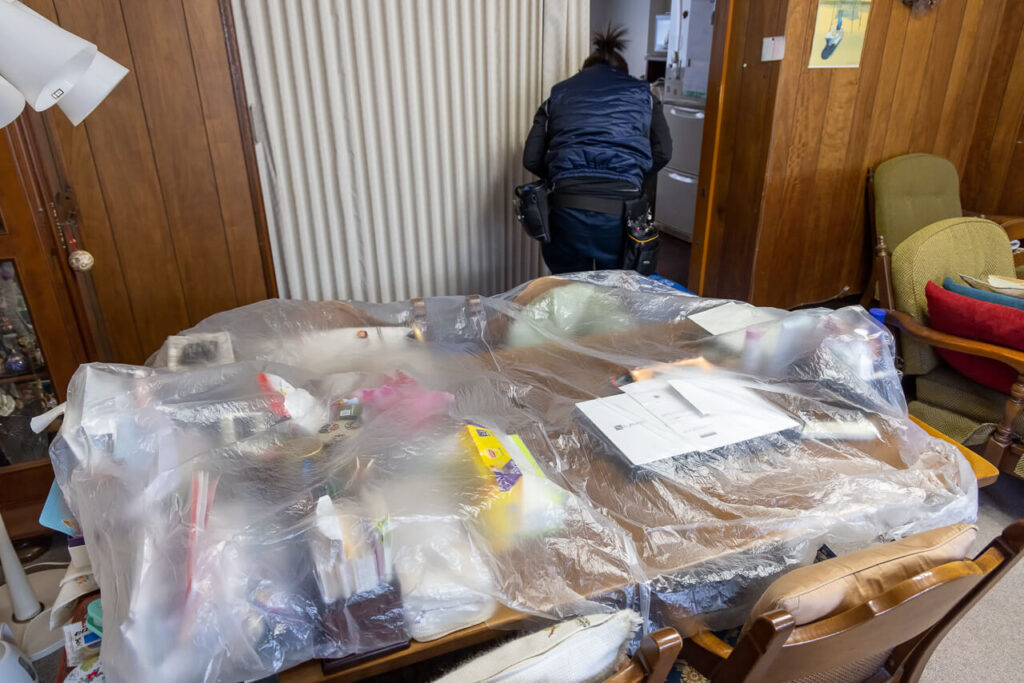 養生するためにブルーシートを引き、テーブルの上には透明なシートをかぶせます。