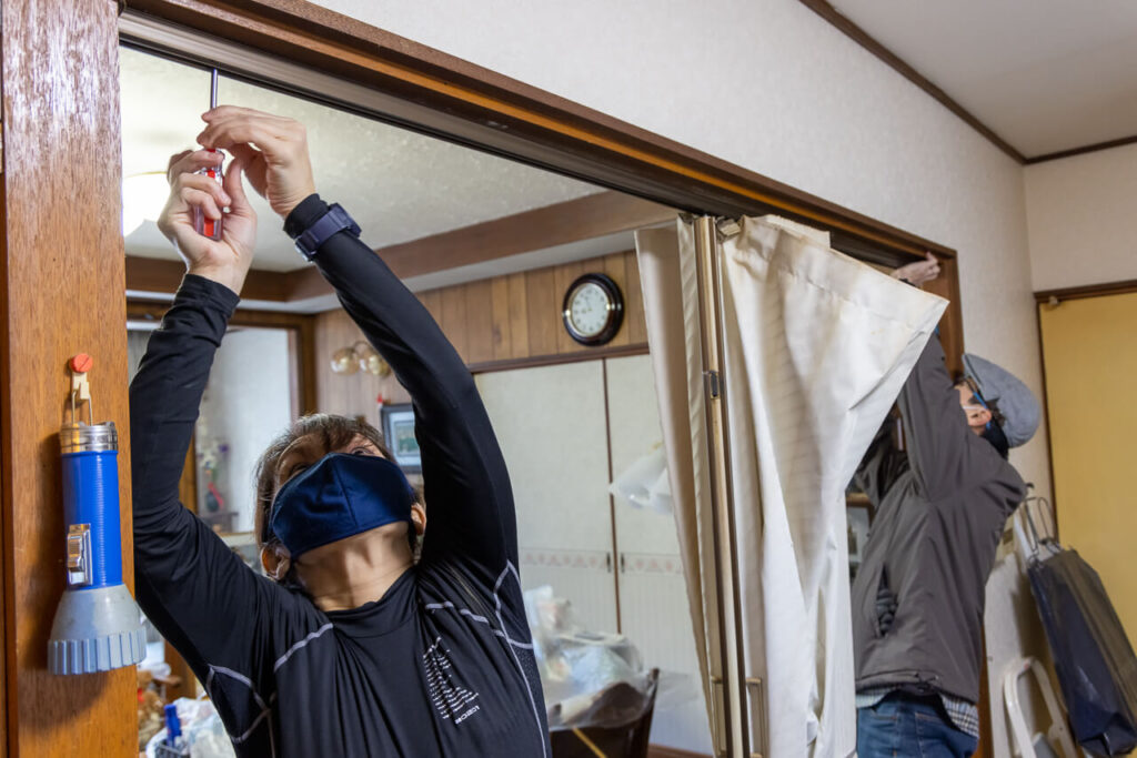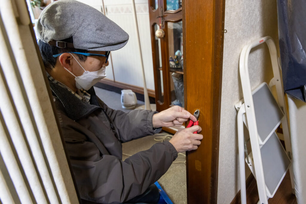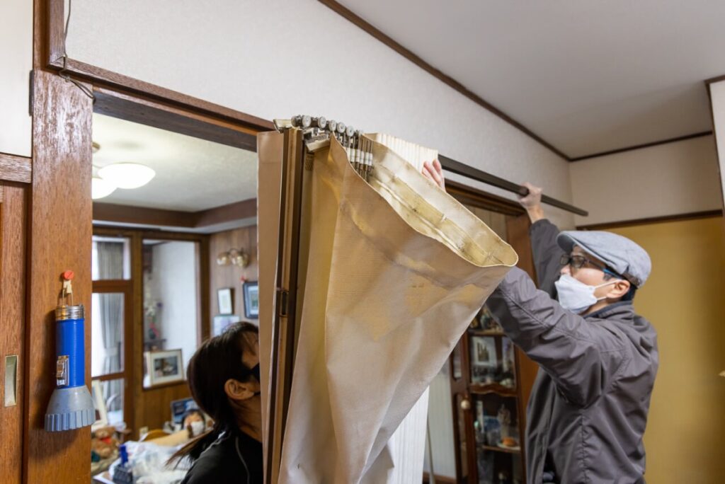 ちいさなリフォームハウスの菊地が穴埋めしている途中、橋本は古いアコーディオンカーテンをまとめていました。