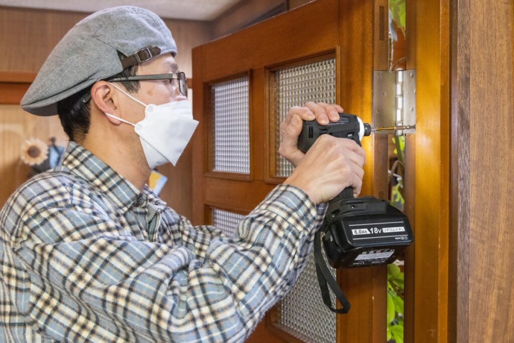 最後に挨拶して帰る直前、代表がドアが下がっていることに気づき、ネジを締め直してもらいました。
